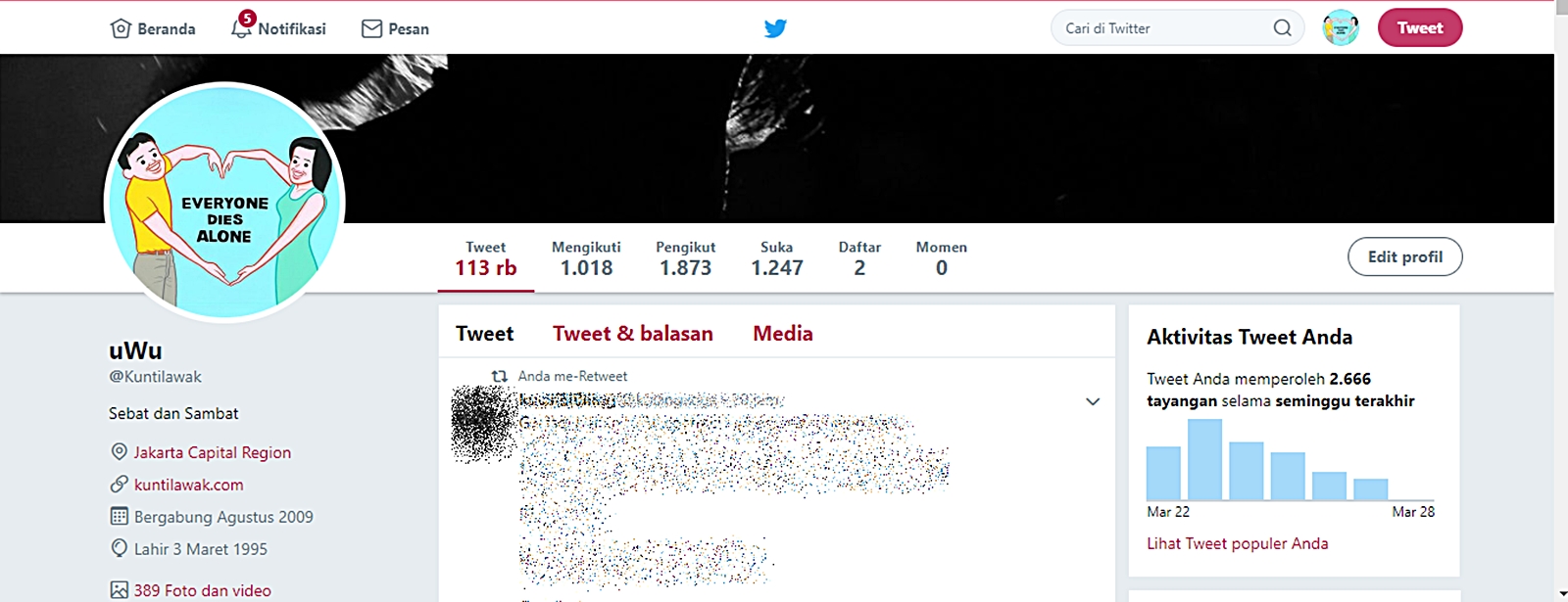 Initially, I was still using social media as a container for expressing and storing other digital waste. But I, who really enjoyed writing and reading since time immemorial, often used social media features to be more serious in writing. Whether it’s the form of personal experience, trivial writing, opinion, poetry, material of theater script, short stories, whatever. Until 2010, I used social media as a free time filler. My Twitter reached the number of 2500 followers at that time, then someone began to take a glance at my ability to write tweets. For the first time, I was paid to write sad tweets for teens. I am very happy, even though the pay is not much. I forgot what the username is, because it is often replaced and when I check back, the account is no longer there. In high school, I rarely play with friends in the real world, busy meeting my cyber friends and playing with them. In 2011 I decided to take a break from Twitter, because I was a little disturbed by my privacy which began to be difficult to close because people tried to find out about me; and I lost lot of followers then.